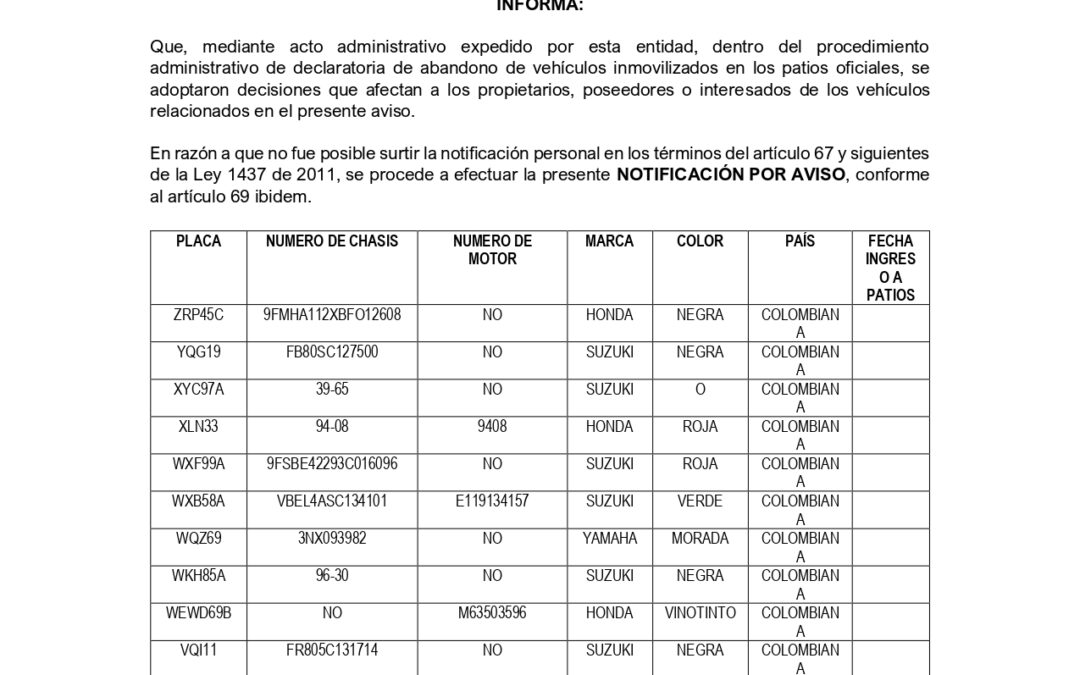 Que, mediante acto administrativo expedido por esta entidad, dentro del procedimiento administrativo de declaratoria de abandono de vehículos inmovilizados en los patios oficiales, se adoptaron decisiones que afectan a los propietarios, poseedores o interesados de los vehículos relacionados en el presente aviso.