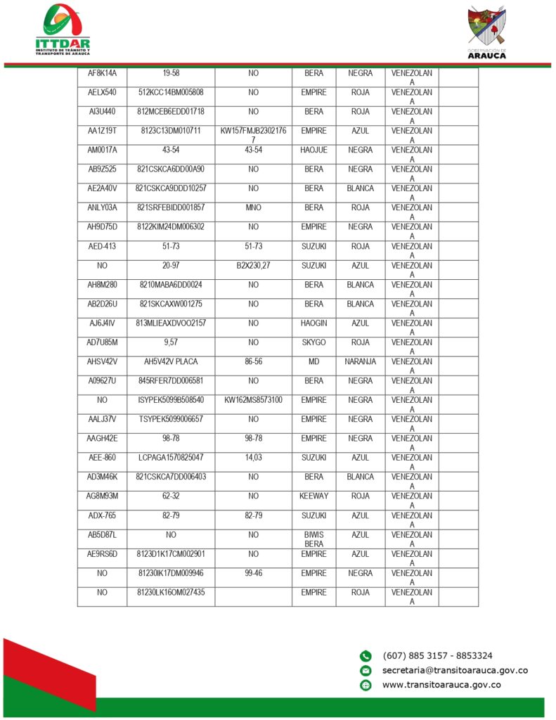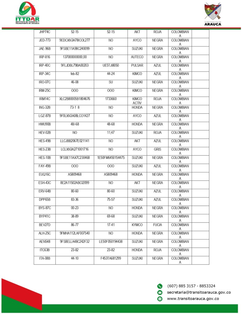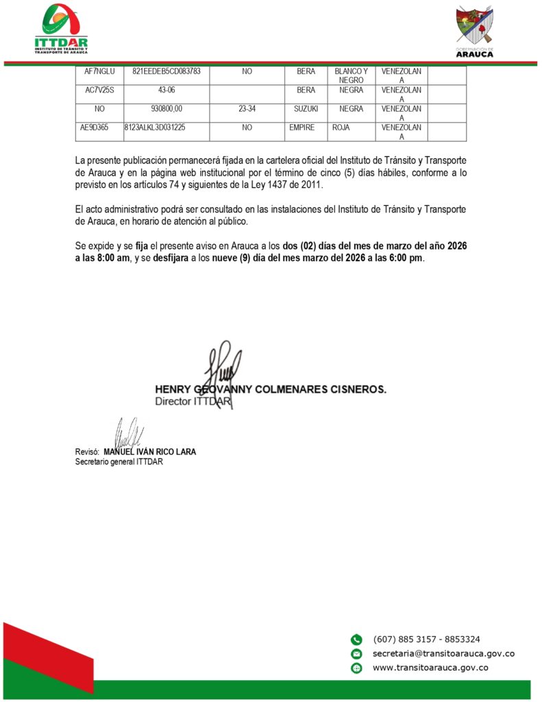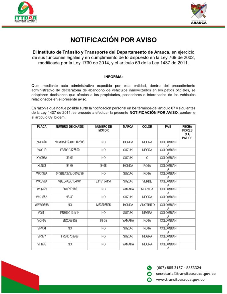 El Instituto de Tránsito y Transporte del Departamento de Arauca, en ejercicio de sus funciones legales y en cumplimiento de lo dispuesto en la Ley 769 de 2002, modificada por la Ley 1730 de 2014, y el artículo 69 de la Ley 1437 de 2011,